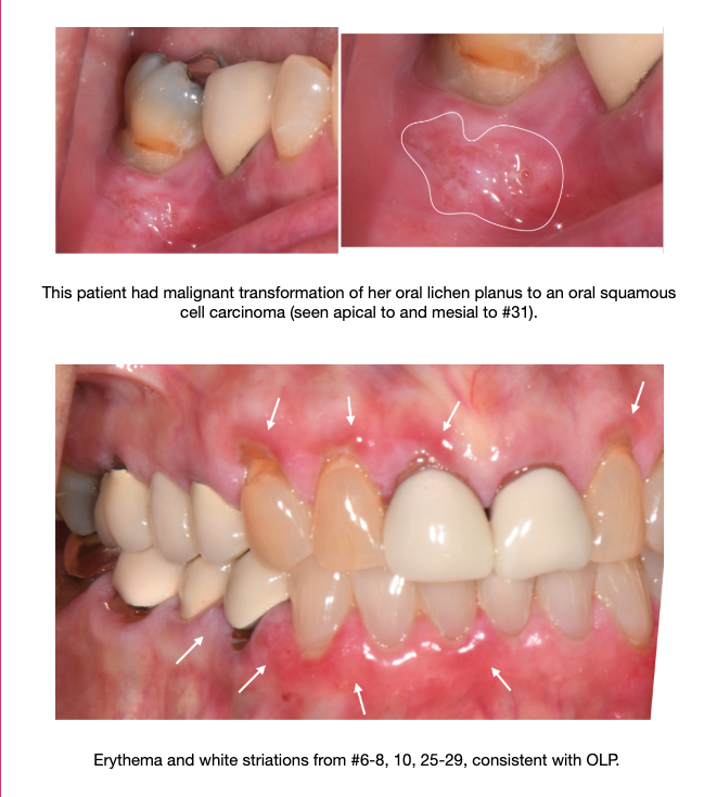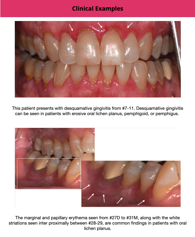 A tissue biopsy is essential for definitive diagnosis, as OLP can mimic other conditions including lichenoid drug reactions, pemphigoid/pemphigus, and even squamous cell carcinoma. Because OLP carries a small but meaningful risk of malignant transformation (estimated at 1–2% over time), histopathologic confirmation allows us to establish a baseline and counsel patients appropriately. For this same reason, we recommend annual monitoring of lichen planus patients to detect any dysplastic changes early. Alternating hygiene or maintenance visits allows us to closely monitor shared lichen planus patients and manage their need for prescription refills or repeat biopsy without the need for extra office visits.
